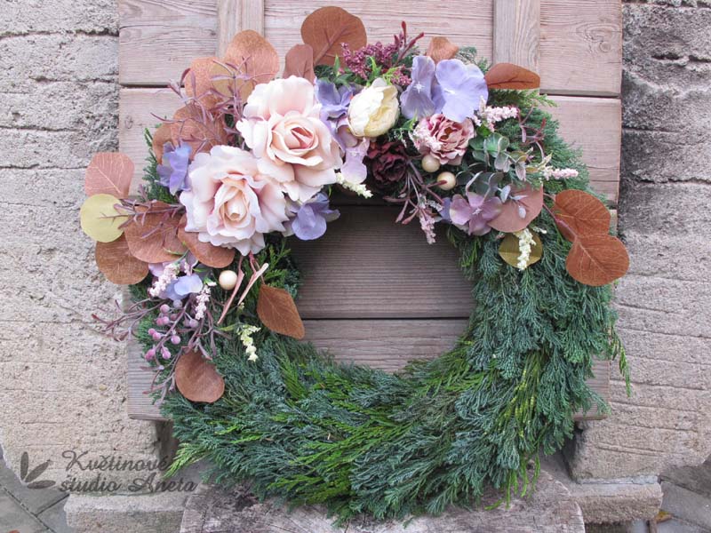 Dušičkový věnec z mixu konifer, průměr cca 45cm ( na podkladu 40cm), dekorovaný podzimní přízdobou. Vzhledem k velikosti výrobku a jeho trvanlivosti, posíláme pouze PPL!