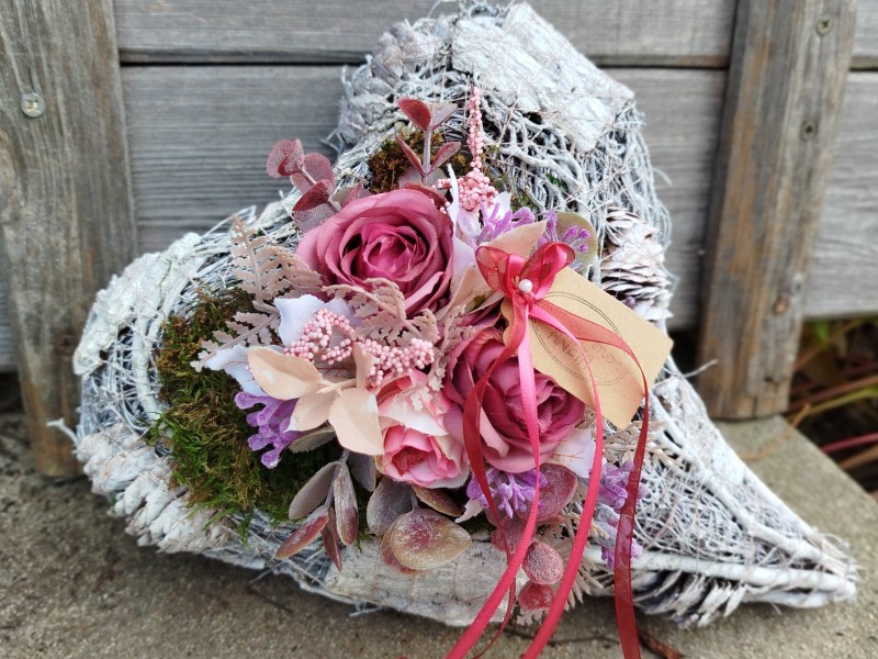 Srdíčko z šedého proutí 30x20cm, dekorované podzimní přízdobou. Vhodné na dušičky i jako podzimní dekorace.