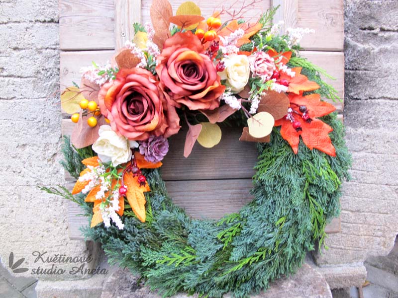 Dušičkový věnec z mixu konifer, průměr cca 45cm ( na podkladu 40cm), dekorovaný podzimní přízdobou. Vzhledem k velikosti výrobku a jeho trvanlivosti, posíláme pouze PPL!