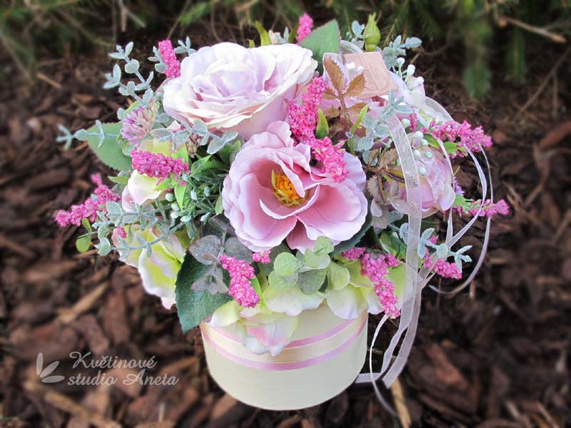 Netradiční, trvanlivé a luxusní pojetí dárkové kytice - Dárková květinová krabička - Kartonová kulatá krabička s aranžmá z látkových květů eustomy, pryskyřníků, eukalyptu aj., doplněná mašlí ze saténové stuhy. Velikost celého aranžmá cca 23x23cm, kabička cca 12x12cm.