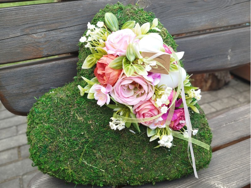 Srdíčko z mechu pr. cca 30cm, dekorované jarní přízdobou. Na položení.