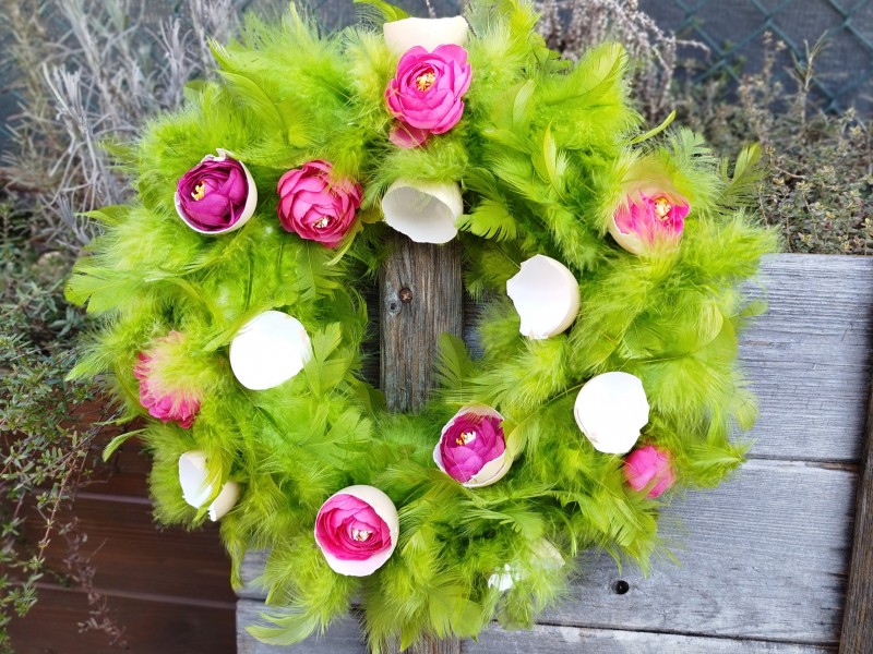 Věneček o průměru cca 28cm + peříčka, věneček je omotán senem, ozdoben umělými květy pryskyřníků, skořápkami a peříčky. Barvy jsou ve skutečnosti sytější, barevnější... jedná se o křehké zboží, doporučujeme přepravu PPL.