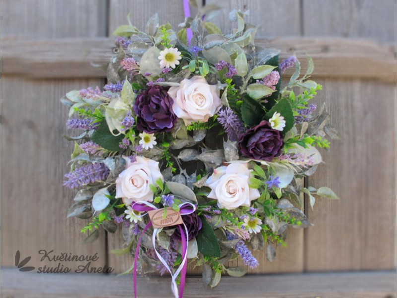 Pr. cca 29cm. Základ z šedo zelených lístků, umělými květy...