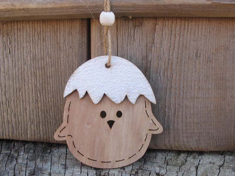 Dřevěné, ploché kuřátko na zavěšení 8x6cm, s perleťovou skořápkou. Tloušťka cca 0,5cm. K doplnění jarních, věnečků, aranžmá atd.