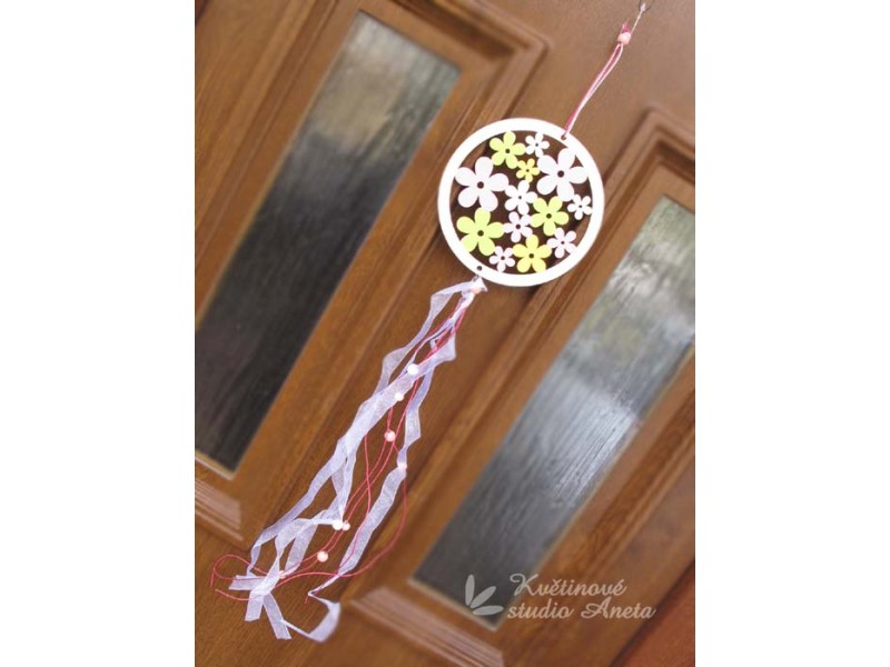 Velmi pěkná dekorace na dveře, stěnu, do prostoru. Dřevěná květinková mandala se závěsem ze stuh a korálků.. 13x70cm.