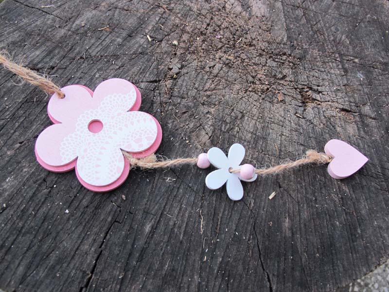 Velmi pěkná dekorace k doplnění aranžmá. Dřevěné květinky na jutovém provázku. Květinky pr. 7cm, 6,5cm, 3cm. Celková délka 27cm.