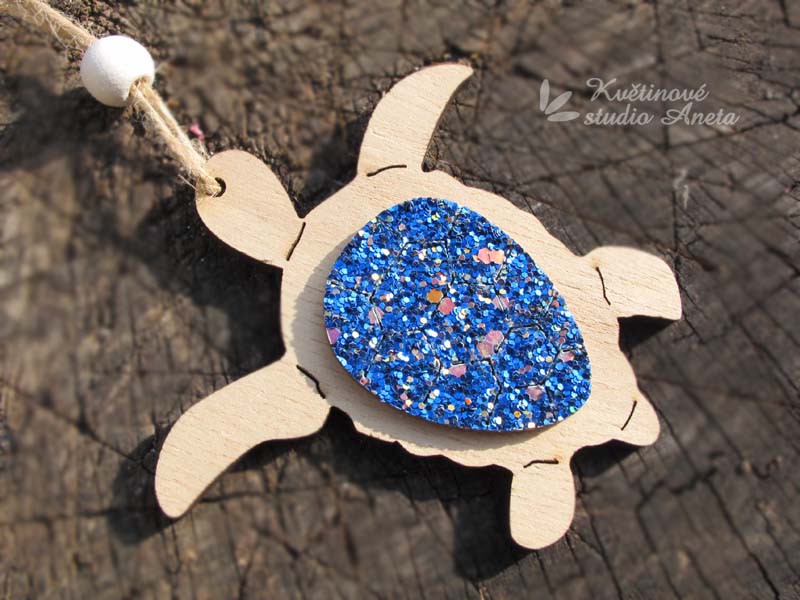 Moc pěkný, dřevěný závěs s glitry - želvička 9x9cm. Tloušťka cca 0,5cm. K doplnění jarních, letních aranžmá, věnečků atd. Na sisálovém provázku z dřevěným korálkem.