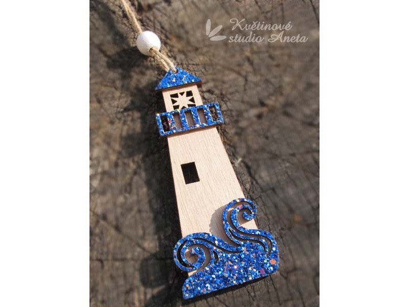 Moc pěkný, dřevěný závěs s glitry - maják 4x11cm. Tloušťka cca 0,5cm. K doplnění jarních, letních aranžmá, věnečků atd. Na sisálovém provázku z dřevěným korálkem.