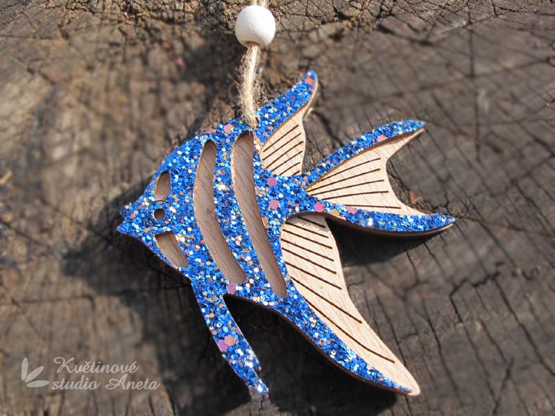 Moc pěkný, dřevěný závěs s glitry - rybka 8x9cm. Tloušťka cca 0,5cm. K doplnění jarních, letních aranžmá, věnečků atd. Na sisálovém provázku z dřevěným korálkem.