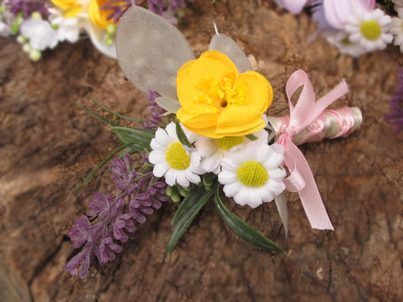 Další romantická svatební kytice z kolekce " Romantic Flowers" uvázaná je z textilních květů krásenky, pryskyřníků, levandule, heřmánku, pomněnek aj. Úvazek je začištěný saténovou smetanovou stuhou a ozdobně převázán stuhou světle růžovou. Průměr kytice cca 30cm . Cena je včetně korsáže a květiny do vlasů. Ke kytici je možné doobjednat náramky, kytičky pro maminky, čelenky...