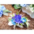 Svatební kytice z naší kolekce "Romantic Flowers" je uvázaná z textilních květů růží, jiřin, hortenzie ve více odstínech modré barvy. Stonky jsou je začištěny saténovou stuhou s ozdobným úvazkem. Průměr kytice cca 30cm, výška 28cm. V četně korsáže pro ženicha a květiny do vlasů. Ke kytici je možné doobjednat čelenku, náramek pro svědkyni atd.
