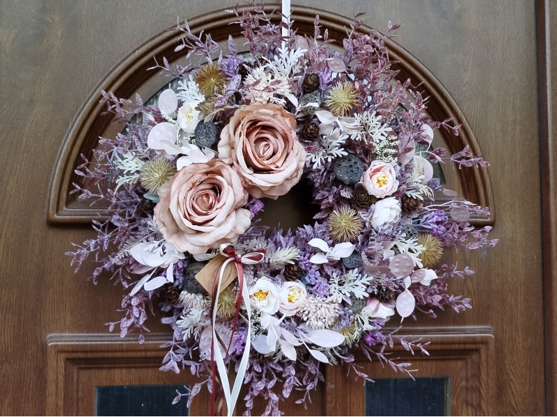Průměr cca 35cm, věneček z umělých lístků s podzimní přízdobou textilních květů, větviček, bodlaků...