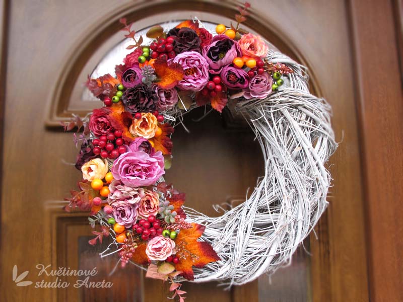 Průměr cca 40cm, věneček ze světle šedého proutí s podzimní přízdobou textilních květů, větviček, jeřabin, žaludů...