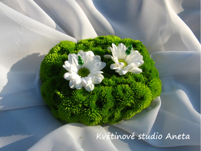 Vypichovaný polštářek na snubní prstýnky z chryzantém.