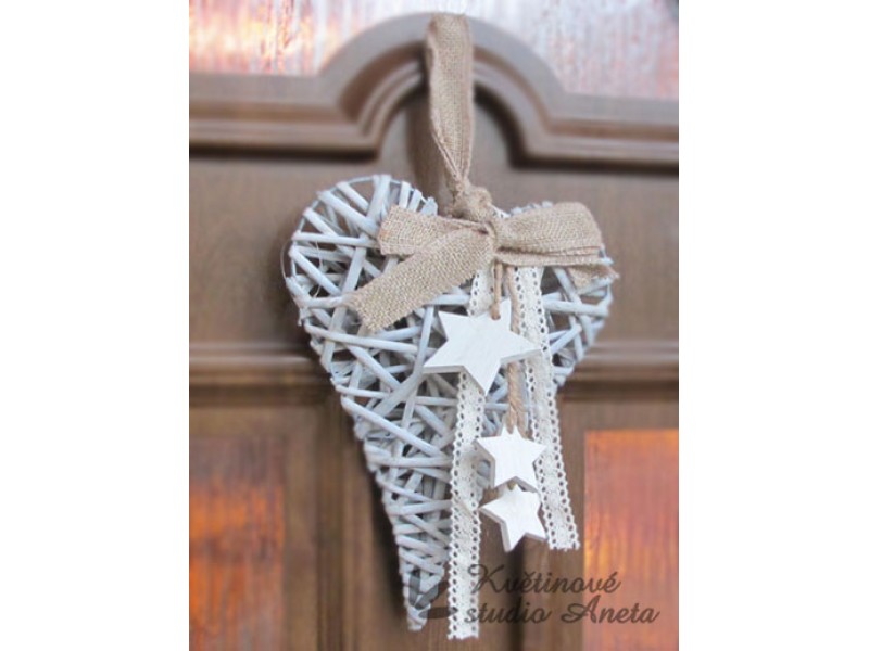 Ratanové srdíčku s šedou patinou doplněné bílými dřevěnými hvězdičkami, jutou a krajkou. 28x20cm.