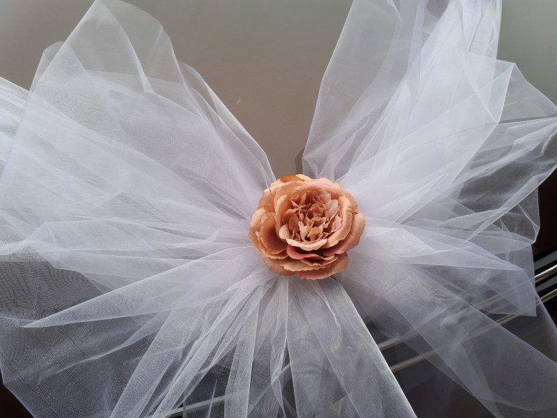 Dodáváme jako roli organzy (9m), 4xkvět na stuze, 2xpřísavku a mašli s květy a přísavkou. Organza se přiváže za zpětná zrcátka, protáhne se mřížkou chladiče nebo očkem na spodní straně kapoty. Na špici se pomocí přísavky umístí mašle s květy. Zbývající květy se přivážou dle potřeby po stranách voálu. Pod prostřední květ je dobré uvázat ještě přiložené přísavky. Organzu doporučujeme použít celou - přehnutou na půl.
