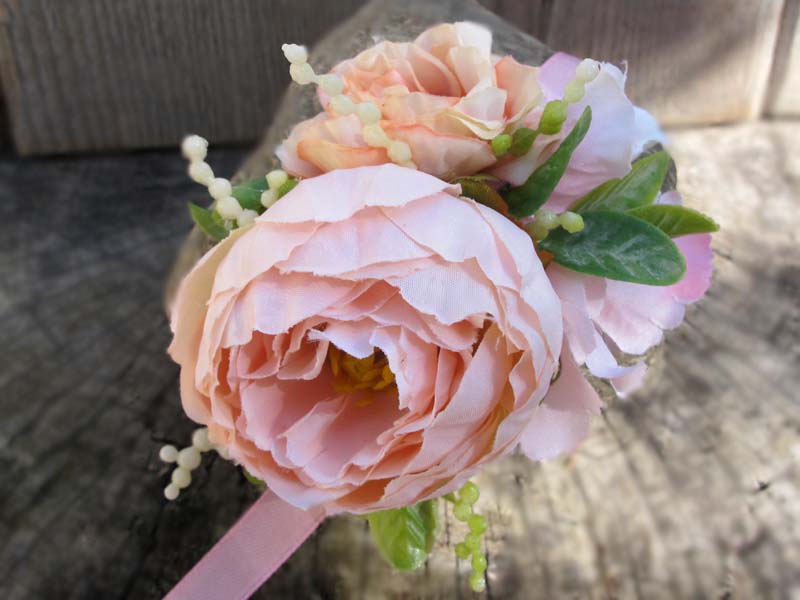 Moc pěkný náramek z látkových květů pivoňky, růží, vřesu aj. na saténové stuze. Vhodný pro svědkyně, družičky i do tanečních! Velikost aranžmá cca 10x6cm.
