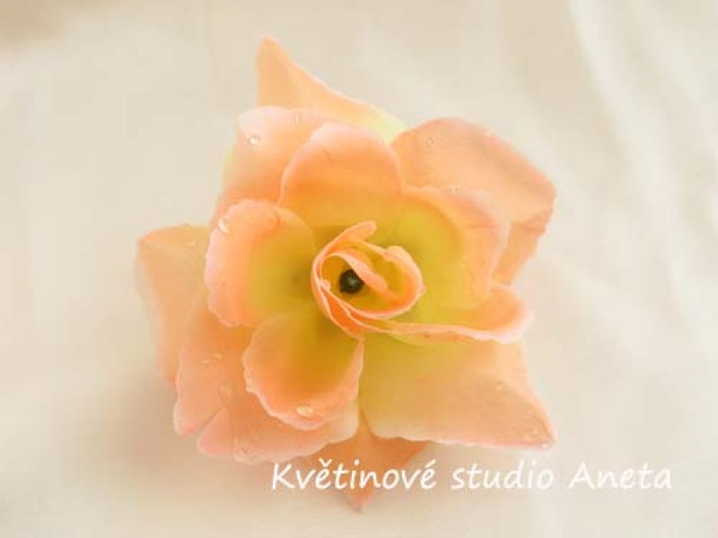 Dekorační látkový květ růže s umělými kapkami rosy. Cca 8-9cm.