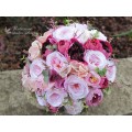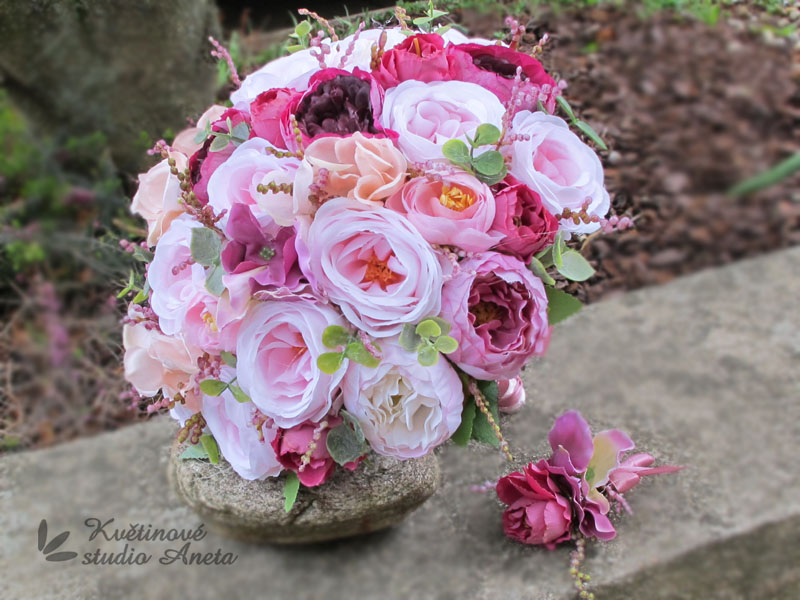 Romantická svatební kytice z naší kolekce " Romantic Flowers" je uvázaná z textilních květů růží, pivoněk, pryskyřníků aj. V barevných odstínech růžové - světlá, pudrová, starorůžová... Úvazek je začištěný světlou růžovou saténovou stuhou a ozdobně převázán stuhou v tmavším odstínu. Průměr kytice cca 26cm, výška 24cm. cena je včetně korsáže. Ke kytici je možné doobjednat náramky, kytičky pro maminky, ozdoby do vlasů... Více foto v záložce.