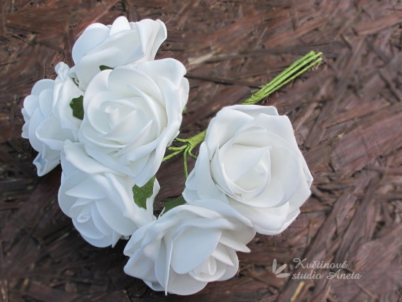 Dekorační pěnové květy růžiček se stopkou z drátku. Pr. květu cca 5,5cm. Stopky 20cm. Lze aranžovat jako svazek nebo jednotlivě.