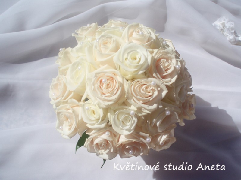 Velmi pěkná a něžná kytice z krémových a bílých růží doplněná perličkami.