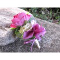 Něžná a bohatá svatební kytice z naší kolekce " Romantic Flowers" je uvázaná z  textilních růžiček, pivoněk,  jiřinek a hortenzií v odstíněch staro růžové, fialové a smetanové barvy. Doplněná ozdobným úvazkem z barevných stuh.  Průměr kytice cca 23cm. Cena je včetně korsáže pro ženicha.  Ke kytici je možné doobjendat čelenku, korsáže pro svědky, tatínky, náramek pro svědkyni atd.