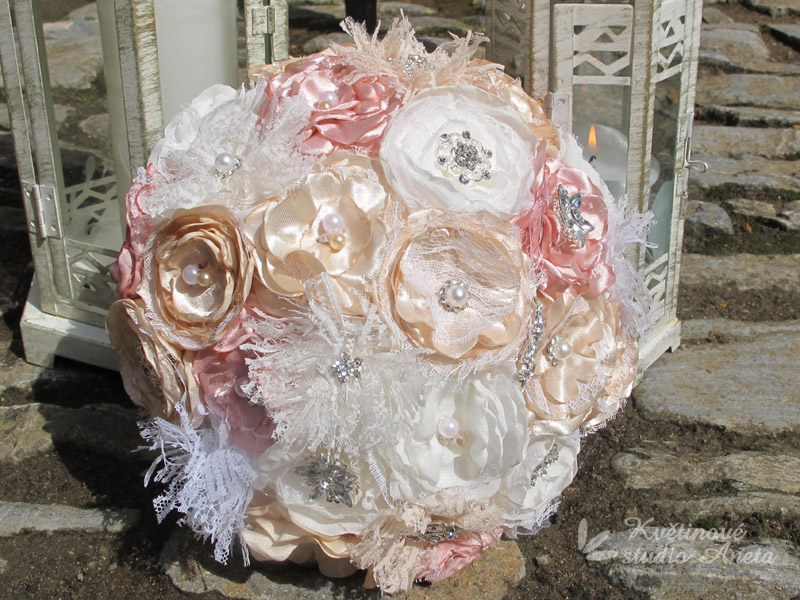 Svatební kytice z ručně vyráběných saténových, taftových a krajkových květů, perliček a štrasových ozdob!  Možné vyrobit i v jiné barvě.  Průměr cca 23cm, výška 23cm.  Možné je také přiobjednat korsáž pro ženicha, kytičky pro maminky, květy do vlasů, náramky, čelenku...