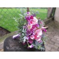 Svatební kytice z naší kolekce " Brillant Flowers" je uvázaná z textilních květů hrachoru, hvozdíků, eustomy, eukalyptu. Úvazek je začištěný fialovou saténovou stuhou. Průměr kytice cca 28cm, výška 23cm. V ceně je svatební kytice, korsáž pro ženicha a spona do vlasů.