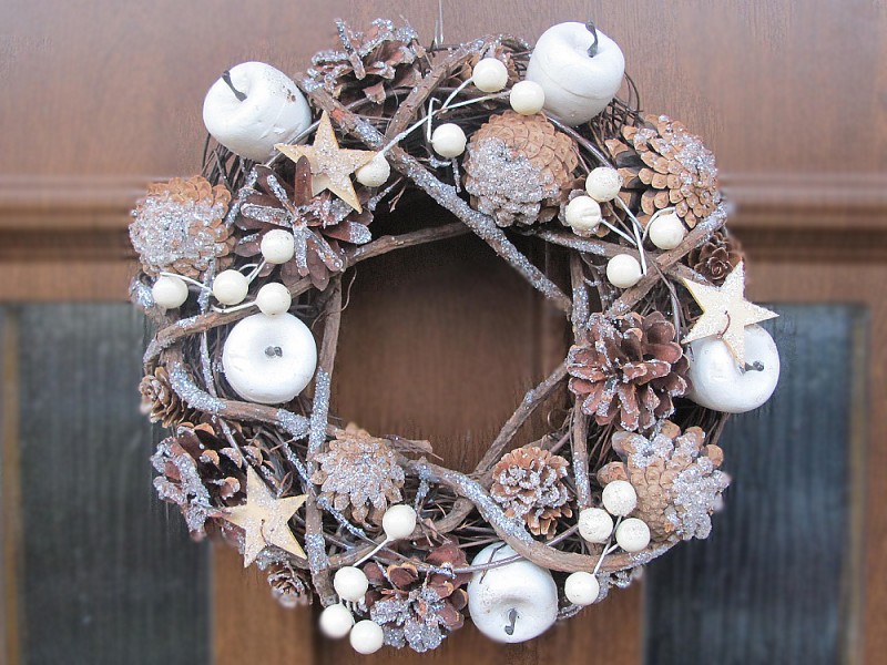 Dekorativní korpus na zimní věnec. Základ je tvořený z šišek a umělých jablíček. Pr. 25cm.