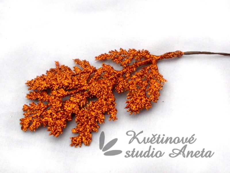 Větvička cypřišku s drobnými lístky, bohatě sypaná třpytkami, na drátku pro snadné aranžování. Délka 11cm + stopka. Šířka cca 4cm.