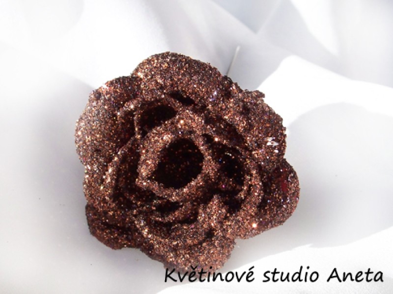 Pr. cca 4cm, velmi dekorativní umělý květ bohatě sypaný třpytkami. Květ je na dlouhém špendlíku, což velmi usnadní jeho aranžování např. do adventního věnce!