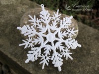 Vločka z bílého plastu, sypaná glitry. Pr. 17,5..