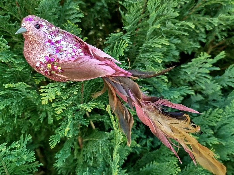 Celková délka cca 24cm. Tělo je pokryti třpytkami a flitry, křídla a ocas jsou z příček. Ptáček je na špejli pro usnadnění aranžování.