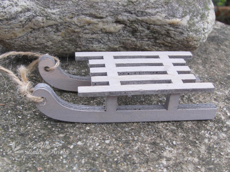 Malé dřevěné sáně na provázku, 9x2,3x3,7cm.