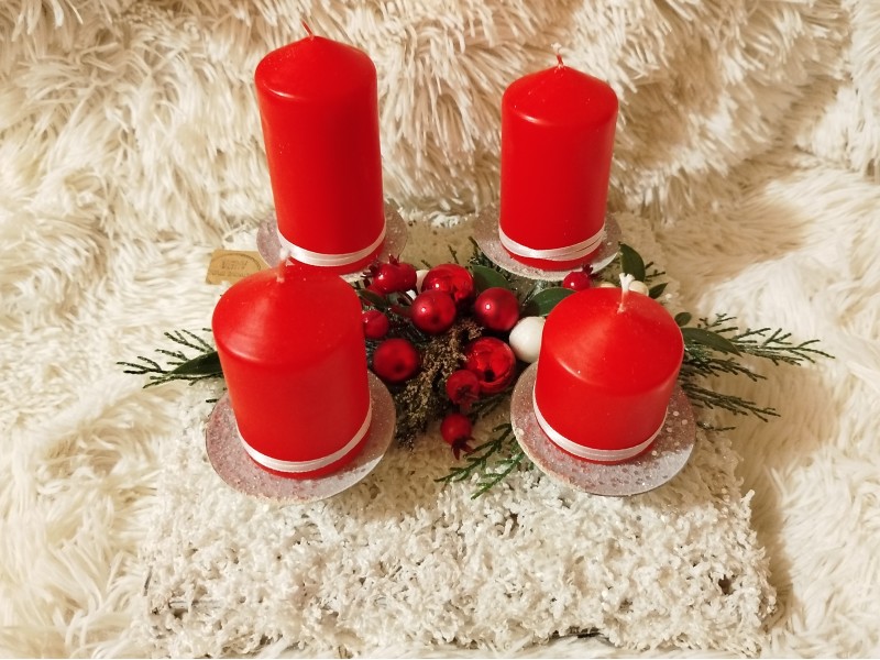 Něžný, elegantní, velmi dekorativní adventní svícen -kovová konstrukce, hustě omotaná vláknem imitujícím sníh. Cca 25x25x3,5cm. Doplněný skleněnými baňkami, větvičkami aj. Cena je včetně svíček zdobených stuhou. Doporučujeme přepravu PPL! Přeprava Českou poštou je s příplatkem 57,- za přepravu křehkého zboží.