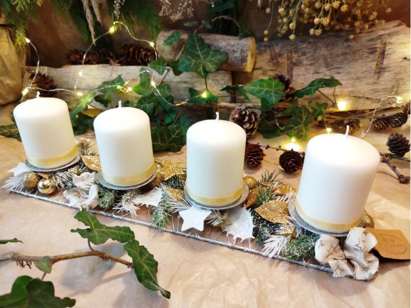 40x10cm, dekorativní adventní svícen z proplétaných drátků doplněný přízdobovým materiálem, včetně svíček.