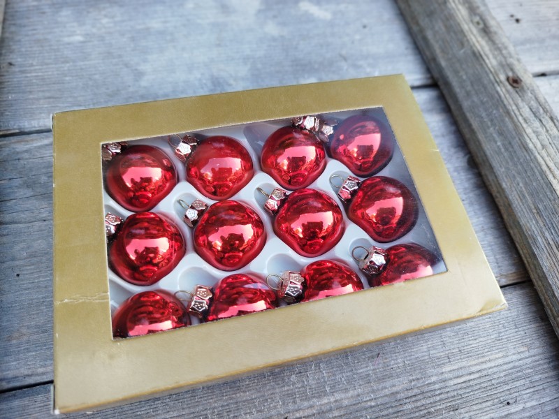 12ks skleněných, vánočních baněk na pověšení, k nalepení na věneček, svícen... velikost cca 3cm. Sleva - Obal může být lehce vyšisovaný, či promáčklý.
