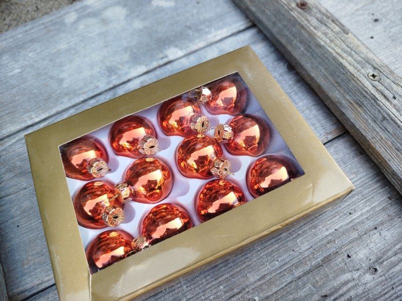 12ks skleněných, vánočních baněk na pověšení, k nalepení na věneček, svícen... velikost cca 3cm. Sleva - Obal může být lehce vyšisovaný, či promáčklý.
