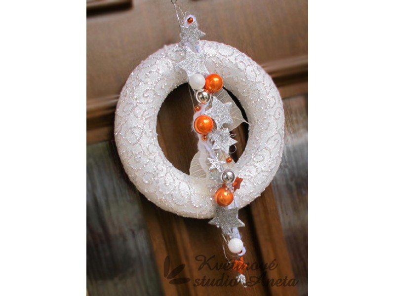 Vánoční dekorace pr. věnce 25cm. Polystyrenový věnec se stříbrným dekorem, doplněný girlandou s drátků, třpytivými ozdobami, sušinou aj.