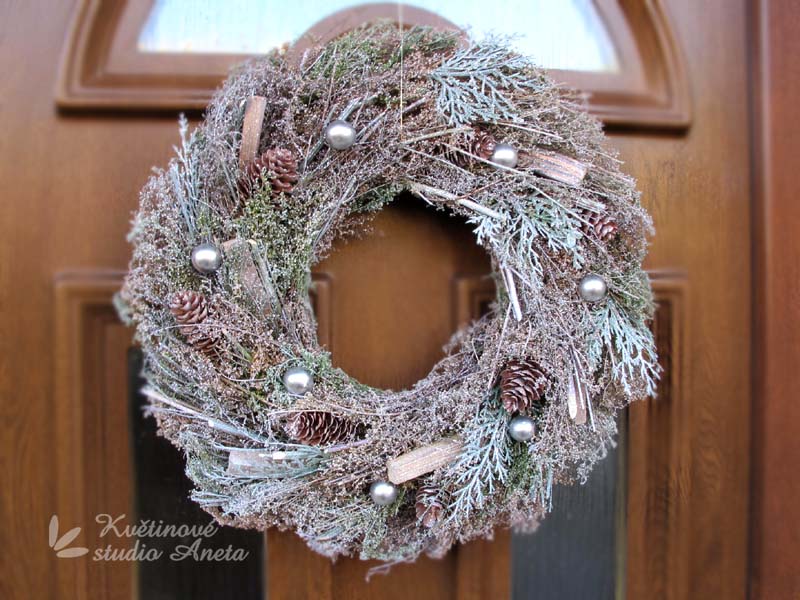 Zimní věnec z jemného šedého proutí doplněný ozdobami, dřevěnými špalíky, šiškami aj. Lehce třpytivý. Pr. cca 38cm. Lze rovnou použít či dále dekorovat jako věnec na dveře nebo doplnit bodce a svíčky...
