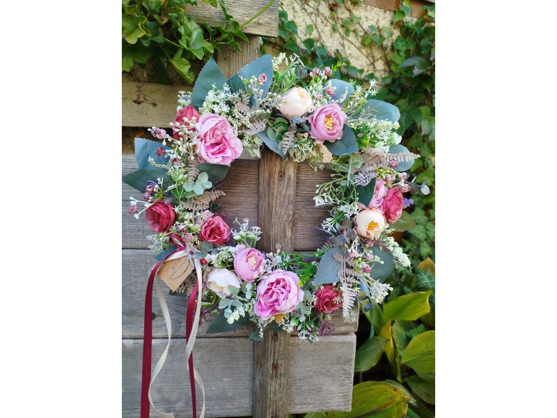 Pr. cca 30cm. Trvanlivý věneček z růží a jemného kvítí. Doplněný saténovou stuhou.