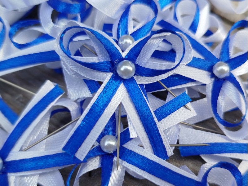 Vývazek, svatební mašlička na myrtu bílá + modrá satén